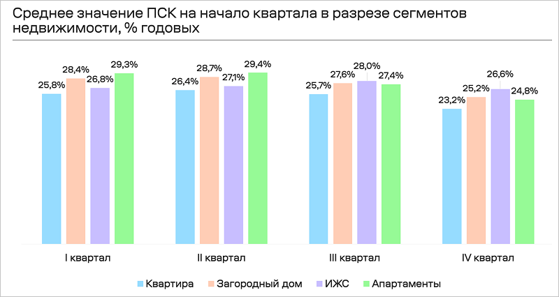 Аналогичная картина наблюдалась и в динамике ПСК: на ипотеку для покупки квартиры в новостройке показатель уменьшился незначительно — с 23,0% до 22,8%, а на «вторичке» — с 28,7% до 23,6%.