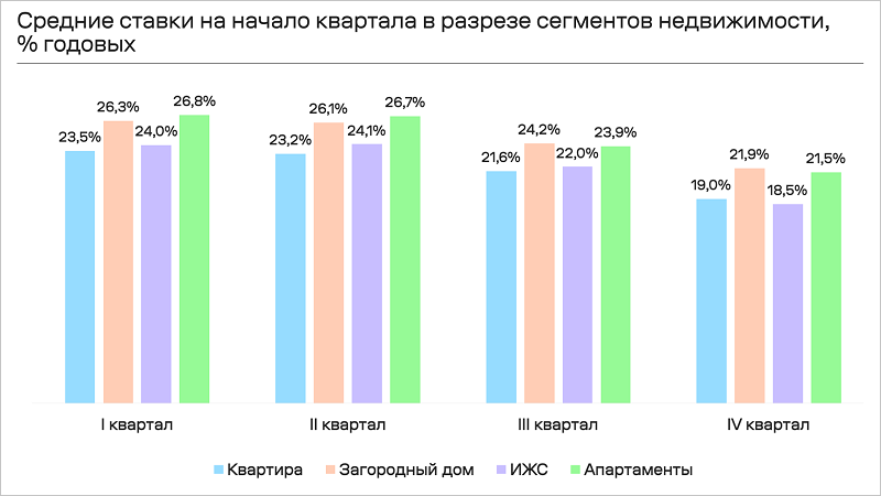Средний максимальный срок кредитования увеличился для всех типов недвижимости и больше всего опять же для апартаментов: с 26,5 года в первом квартале до 28,1 года — в четвертом.