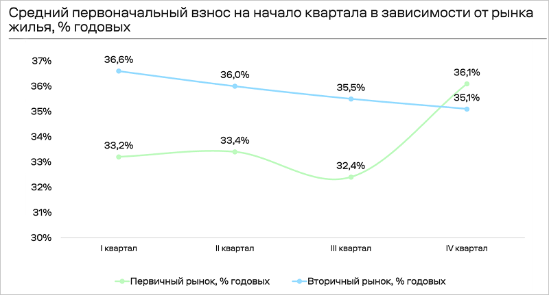 Средний первоначальный взнос для покупки готовой квартиры за год сократился на 1,5 п. п. до 35,1% от стоимости жилья.