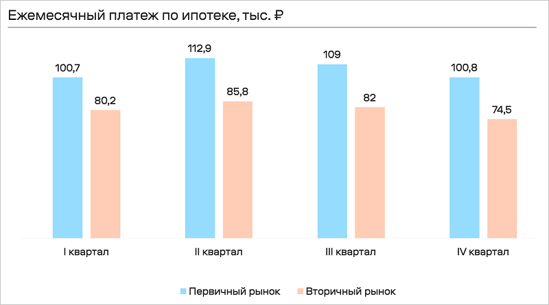 Ежемесячный платеж по ипотеке на приобретение квартиры на первичном рынке не поменялся (100,8 тыс. руб.), а на вторичном снизился с 80,2 тыс. руб. до 74,5 тыс. руб.