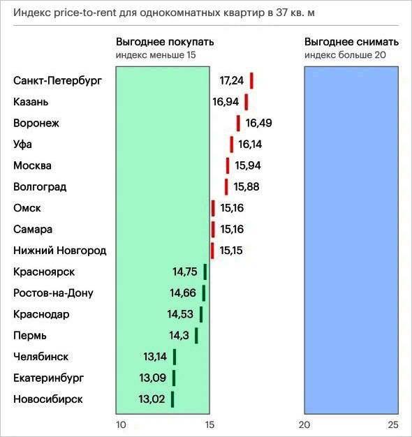 На данный момент ни один российский мегаполис не попадает в ту зону, где жилье рекомендуется снимать: в каждом из них значение индекса ниже 20 баллов.