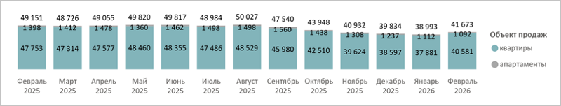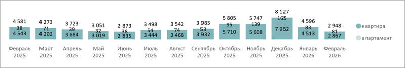 В последний месяц зимы на областном рынке новостроек было зарегистрировано 2,9 тыс. ДДУ (-36% за месяц, -36% за год): из них 81 сделка с апартаментами и 2,9 тыс. ДДУ с квартирами.