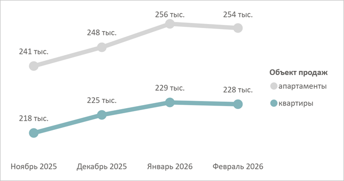 Средневзвешенная цена (СВЦ) 1 кв. м квартир и апартаментов за второй месяц года не изменилась (228 770 руб.), а за год прибавила 16%.