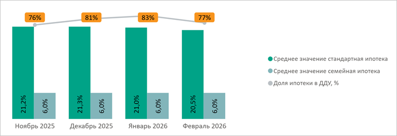 Доля сделок с привлечением ипотечного кредита за февраль сократилась на 6 п. п., до 77%. Средняя ставка базовой ипотеки за месяц понизилась на 0,5 п. п., до 20,5%.