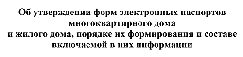 Согласно проекту приказа «Об утверждении форм электронных паспортов многоквартирного дома и жилого дома, порядка их формирования и состава включаемой в них информации», для каждого многоквартирного дома (МКД) будет формироваться электронный паспорт, содержащий следующие данные:
