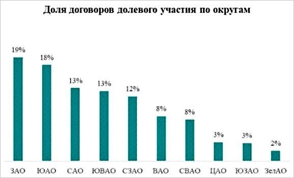 Наименьшая доля сделок пришлась на Центральный (3%), Юго-Западный (3%) и Зеленоградский (2%) административные округа.