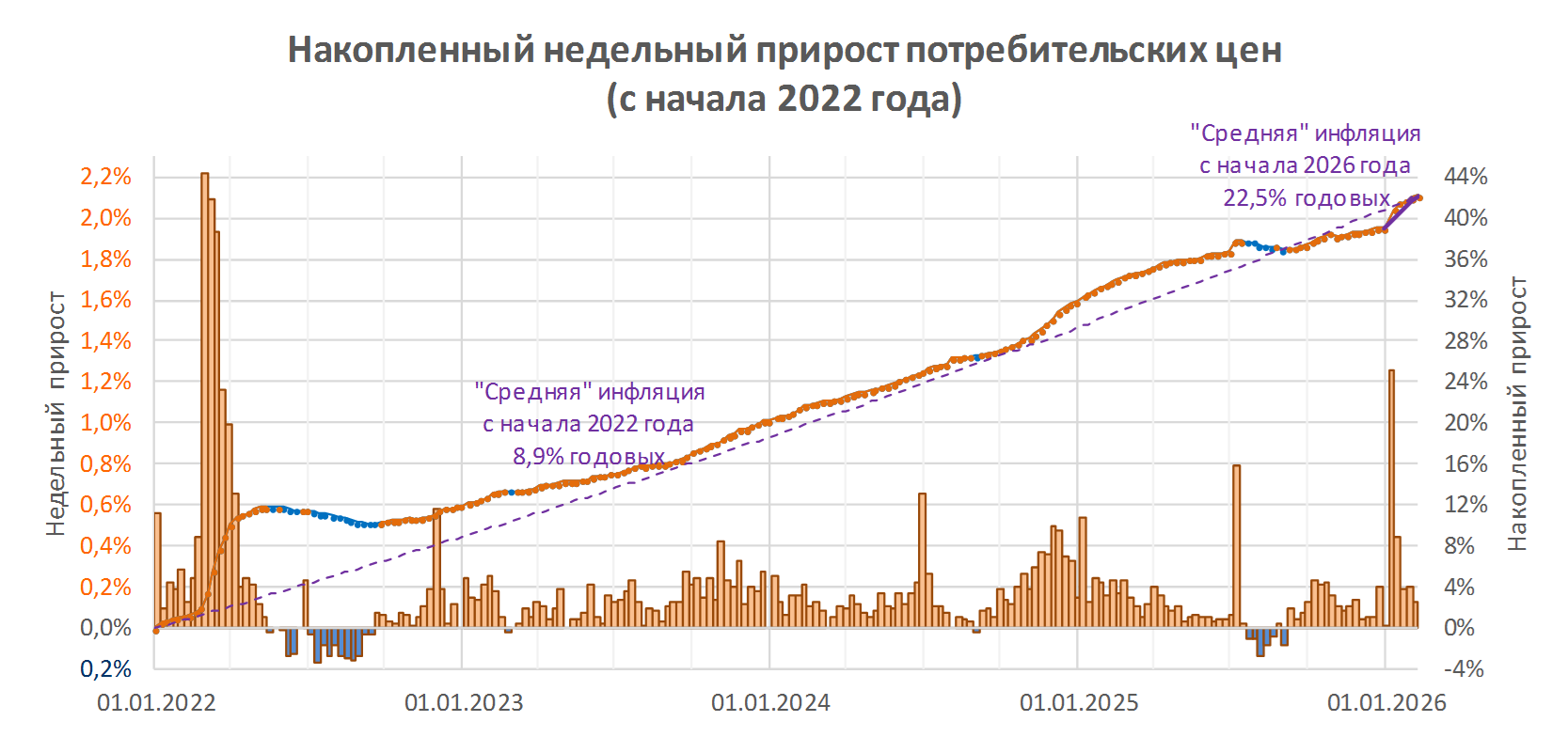 По данным Росстата, с начала 2026 года цены выросли на 2,24%, что превышает 22% годовых. В среднем с начала 2022 года инфляция составляет 8,9%.
