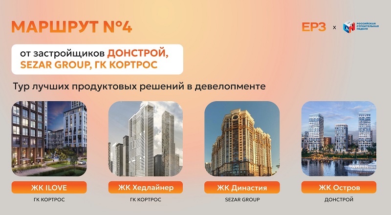 В фокусе Маршрута №4 окажутся ЖК Остров от ДОНСТРОЙ, ЖК ILOVE и ЖК Хедлайнер от ГК КОРТРОС, а также ЖК Династия от Холдинга Sezar Group.