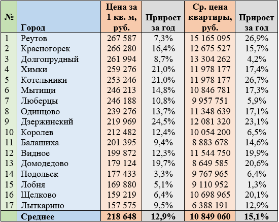 В среднем по городам — спутникам столицы 1 кв. м прибавил в цене 12,9%, до 218,6 тыс. руб.