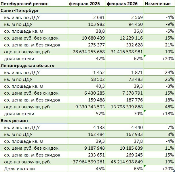 По сравнению с январем 2025 года количество розничных продаж квартир и апартаментов по ДДУ и уступкам в Петербургском регионе увеличилось на 7%, а их средняя стоимость — на 11%.