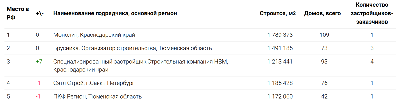 Вторая позиция, как и ранее, у подрядчика «Брусника. Организатор строительства» (ИНН 6671397475) с 73 МКД на 1,5 млн кв. м в строительстве.