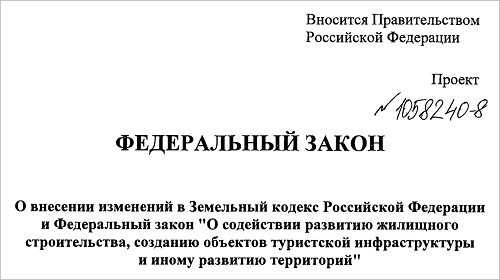 Об этом говорится в законопроекте №058240-8 «О внесении изменений в Земельный кодекс РФ и ФЗ "О содействии развитию жилищного строительства, созданию объектов туристской инфраструктуры и иному развитию территорий"», внесенном на рассмотрение депутатов Госдумы.