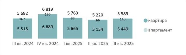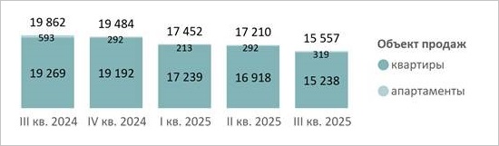 Это 15,2 тыс. квартир (-10% за квартал, -21% за год) и 0,3 тыс. апартаментов (+9% за квартал, -46% за год).