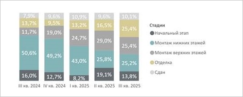 Увеличилась до 25,4% доля предложения на стадии отделки (+8,9 п. п. за квартал и +11,7 п. п. за год).