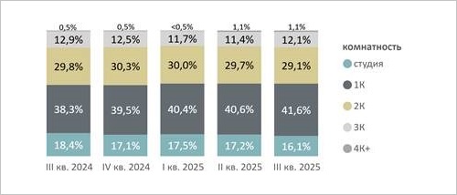 Сократилась доля студий (16,1%, -1,1 п. п.) и двухкомнатных квартир (29,1%, -0,6 п. п.).