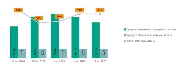В III квартале в Новой Москве зарегистрировано 5,6 тыс. ДДУ (+7% за квартал, -2% за год). Доля сделок с привлечением ипотечного кредитования составила 71% (-1 п. п. за квартал, -7 п. п. за год).