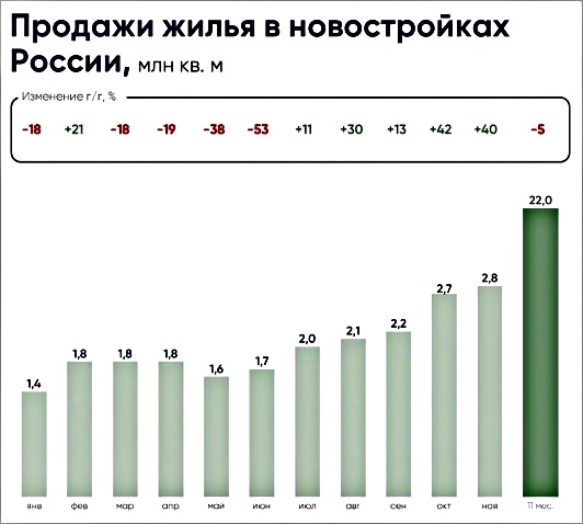 В целом за январь — ноябрь продано 22 млн кв. м новостроек на 4,4 трлн руб. (-5% по количеству по сравнению с тем же периодом 2024-го, но +4% в денежном выражении).