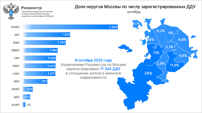 В октябре 2025 года в столице зарегистрировано 11 344 договора участия в долевом строительстве (ДДУ) в отношении жилой и нежилой недвижимости. При этом 26% ДДУ оформлено в Новой Москве — 2 955 договоров.