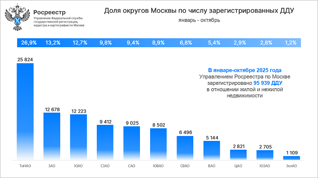 Всего за январь — октябрь текущего года в столице зарегистрировано 95 939 ДДУ, причем на Новую Москву приходится 25 824 договора участия в долевом строительстве, или 26,9%.