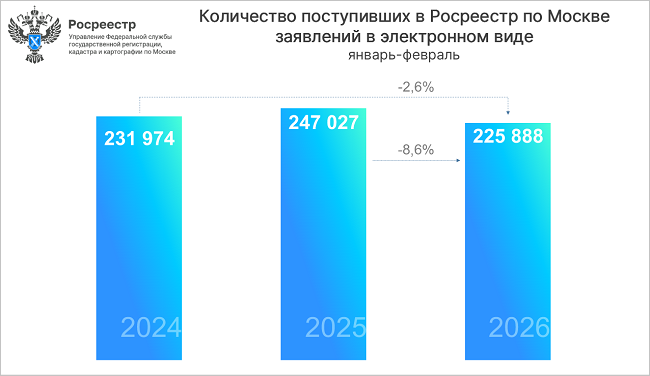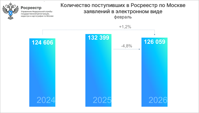 Заместитель руководителя Управления Росреестра по Москве Мария Макарова отметила, что количество принятых в феврале 2026 года онлайн-заявлений более чем на четверть превосходит результат января, в то время как в 2025-м и 2024 годах аналогичная динамика составляла 16%.