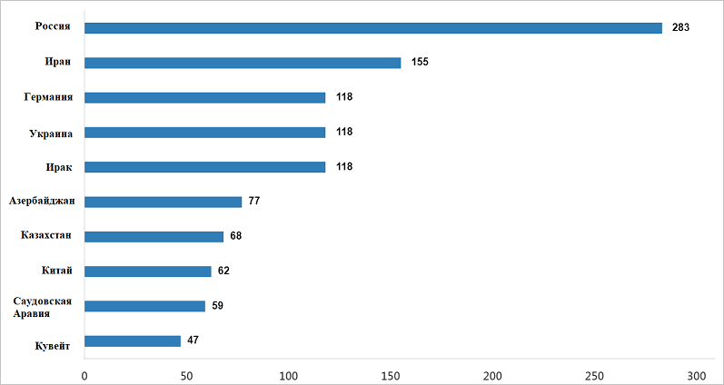 На третьей позиции рейтинга сразу три страны — Германия, Украина и Ирак (по 118 домов и квартир). Далее следуют Азербайджан (77 объектов) и Казахстан (68 объектов).