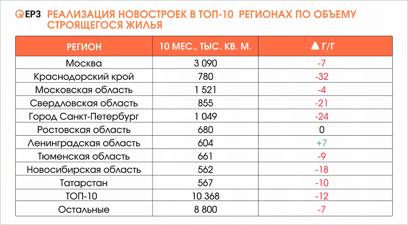 Тверская область улучшила свое место в ТОП на две позиции за счет существенного прироста в продажах. Рязанская область ухудшила место в ТОП на три позиции из-за активизации вывода новых проектов. При этом оба региона остались в зоне с отрицательным накопленным затовариванием.