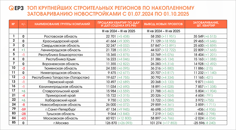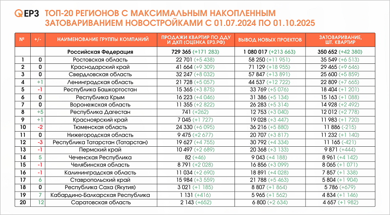 Лидерство в рейтинге среди регионов с наибольшим затовариванием новостройками удерживает Ростовская область, где с 01.07.2024 по 01.10.2025 разница в выводе и продажах составила 35 549 квартир (+6 513 за III квартал 2025 года).
