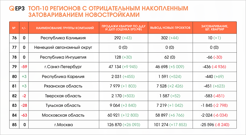 Сразу на 63 позиции улучшила свое положение в ТОП Московская область (на фото ниже). За квартал затоваривание в Подмосковье сократилось на 6 034 квартиры за счет резкого снижения темпов вывода новых проектов (накопленное за 15 месяцев перепроизводство составило в регионе -2 024 лота).
