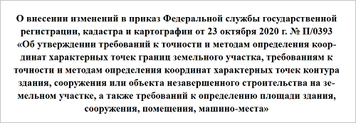 Документ регистрационного ведомства называется «О внесении изменений в приказ Федеральной службы государственной регистрации, кадастра и картографии от 23 октября 2020 г. №П/0393 "Об утверждении требований к точности и методам определения координат характерных точек границ земельного участка, требованиям к точности и методам определения координат характерных точек контура здания, сооружения или объекта незавершенного строительства на земельном участке, а также требований к определению площади здания, сооружения, помещения, машино-места"».