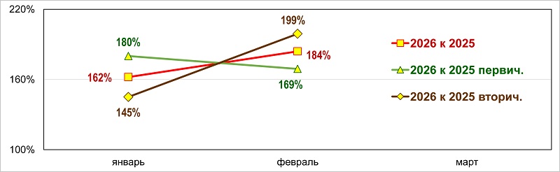 Количество ипотечных жилищных кредитов в 2026 году в % к 2025-му (нарастающим итогом)