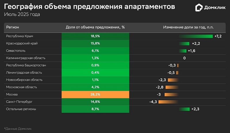 Так, Республика Крым за год заняла долю 18,5% российского рынка «апартов» (+7,2 п. п.), Краснодарский край — 15,8% (+2,2 п. п.), Севастополь — 6,1% (+1,6 п. п.).