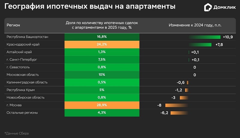 Аналитический центр Домклик провел исследование рынка апартаментов и на основе этих данных составил рейтинг территорий с наибольшим количеством ипотечных сделок и объявлений о продаже.