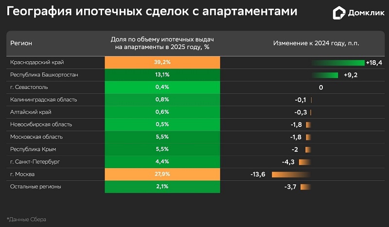 Более очевидны изменения в объеме выдач ипотечных кредитов. Краснодарский край в 2025-м практически достиг показателя в 40%. Кроме него в ТОП вошли Крым, Севастополь и Калининградская область.