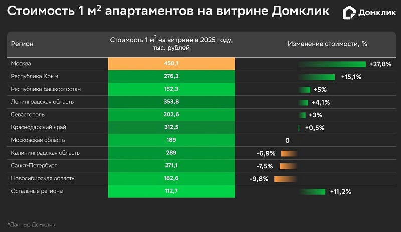 Апартаменты практически полностью следуют тренду российского рынка недвижимости: цены на них продолжают расти. В Крыму 1 кв. м подорожал на 15,1%, в Республике Башкортостан — на 5%, в Ленинградской области — на 4,1%, в Севастополе — на 3%.
