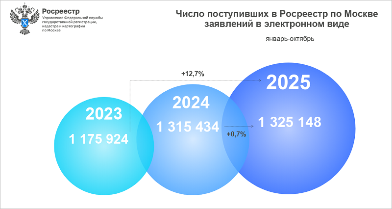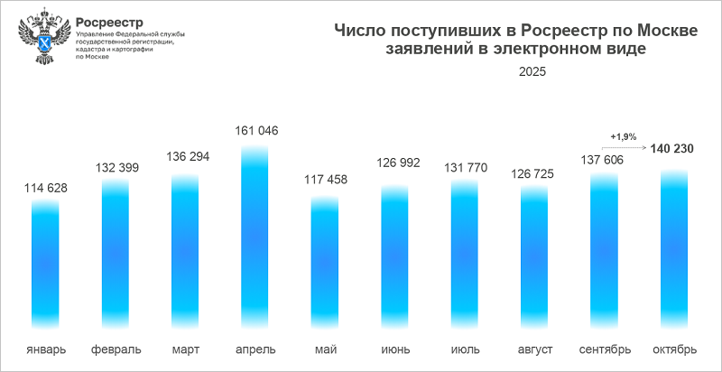 Только в октябре 2025 года специалисты Управления Росреестра по Москве приняли 140 230 онлайн-заявлений (+1,9% к сентябрю, когда было 137 606 обращений).