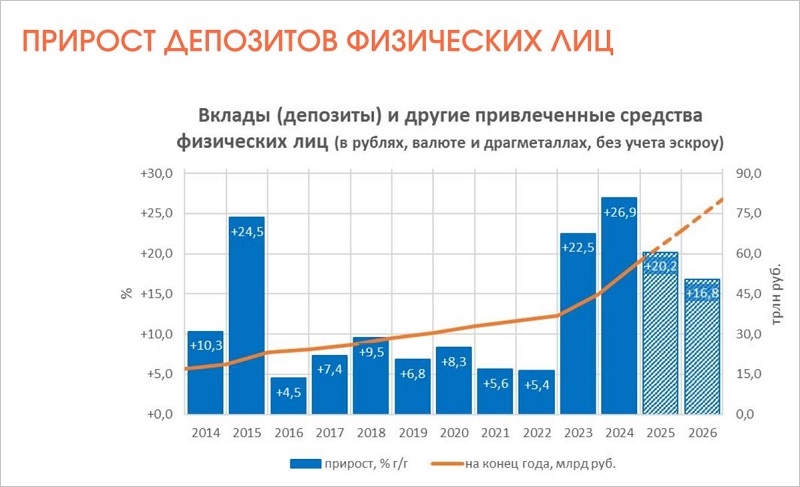 Кирилл Холопик также подчеркнул, что экстраполяция текущих данных по депозитам показывает, что тренд на накопление гражданами средств на депозитах, произошедший в 2023—2024 годах, сменяется снижением темпов прироста депозитов.