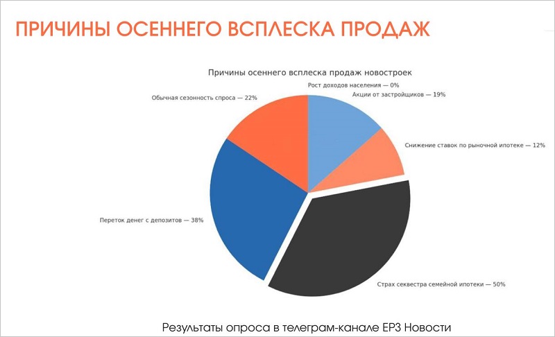 Вместе с тем, как добавил эксперт, большинство участников опроса (50%), проведенного ЕРЗ.РФ, главной причиной осенней активизации продаж новостроек назвали страх введения новых ограничений по «Семейной ипотеке».