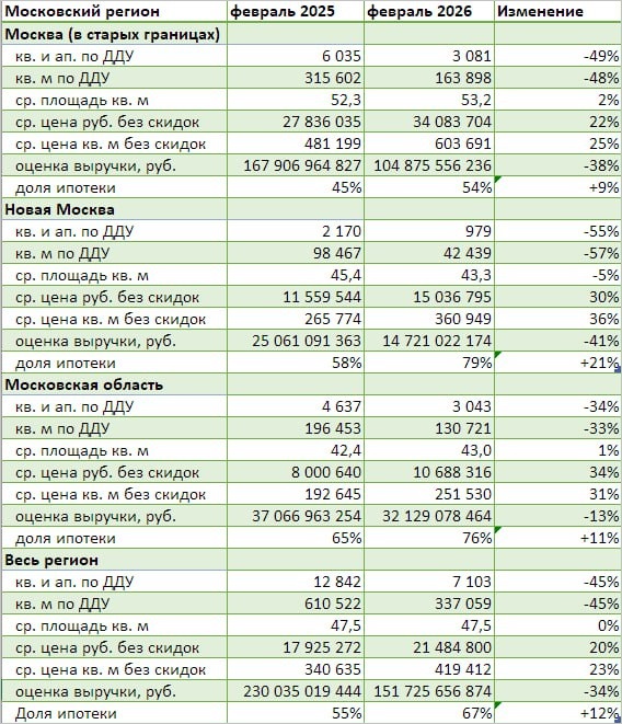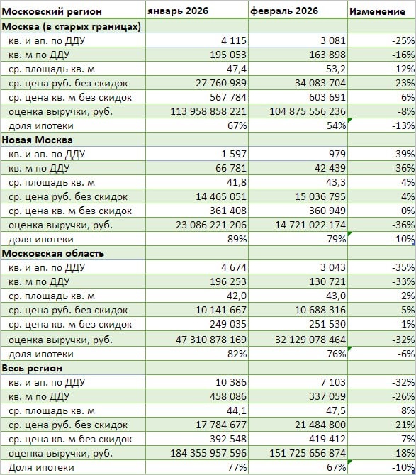 По сравнению с февралем 2025-го число сделок по ДДУ и уступкам уменьшилось на 45%: в Старой Москве — на 49%, в Новой — на 55%, в Подмосковье — на 34%.