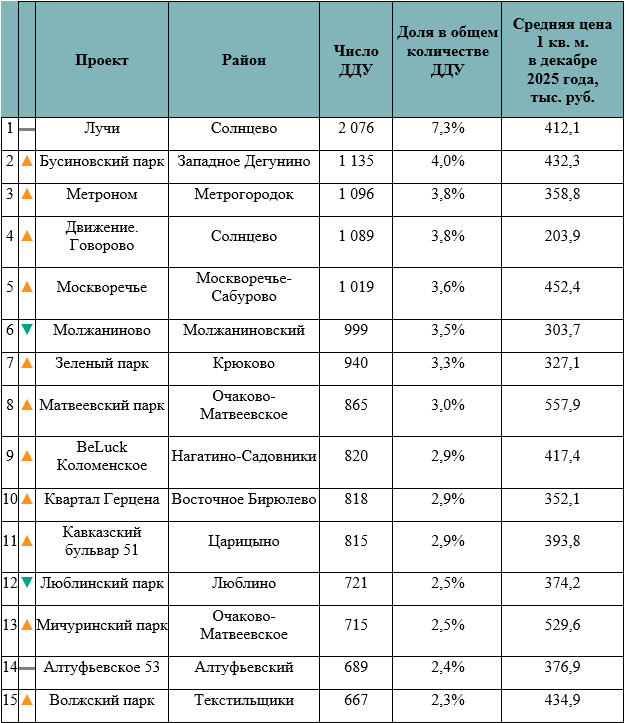 По данным Метриум, в 2025-м в массовом сегменте Старой Москвы было совершено 28,5 тыс. сделок по ДДУ, что на 0,5% меньше, чем в 2024-м. Доля 15 наиболее востребованных проектов выросла на 3,4 п. п., а их список обновился на восемь позиций.