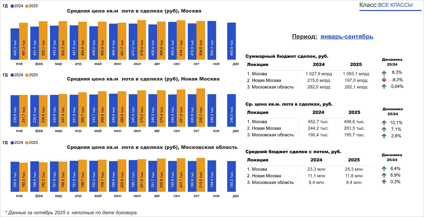 Цена 1 кв. м в исторических границах столицы в октябре снизилась до 504,6 тыс. руб. (-1,8% относительно сентября). В ТиНАО выросла до 290,1 тыс. руб. (+3,1%), в Подмосковье — до 210,0 тыс. руб. (+1,4%).