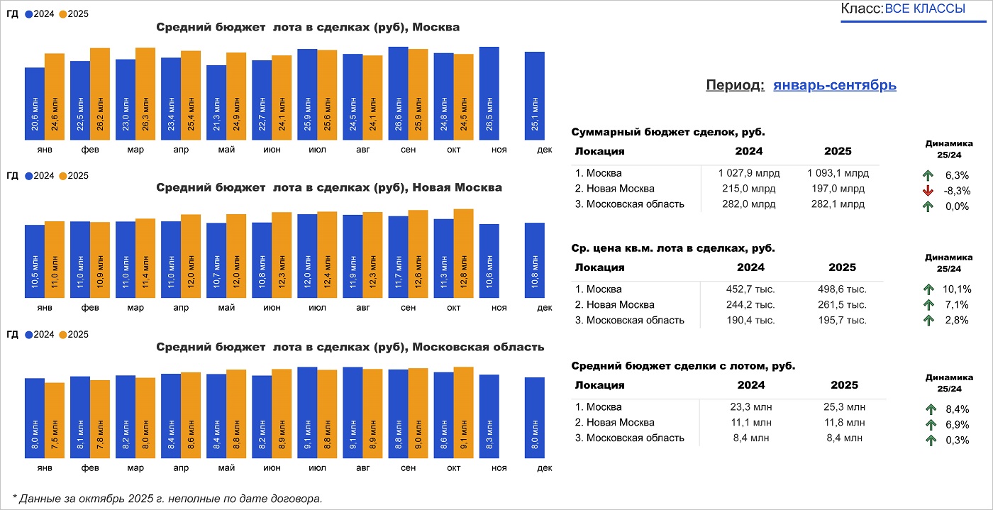 Средний бюджет сделки в Белокаменной сократился до 24,5 млн руб. (-5,4%). В Новой Москве увеличился до 12,8 млн руб. (+1,6%), в области — до 9,1 млн руб. (+1,1%).