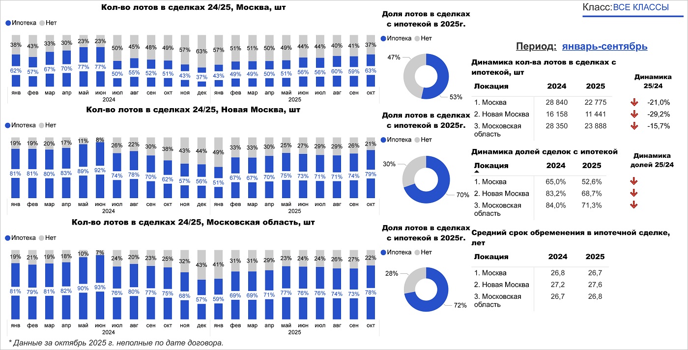 Если сравнивать с началом года, то с каждым месяцем доля сделок с ипотекой становится все больше. В октябре в Старой Москве она поднялась до 63%, в ТиНАО — до 79%, в Подмосковье — до 78%.