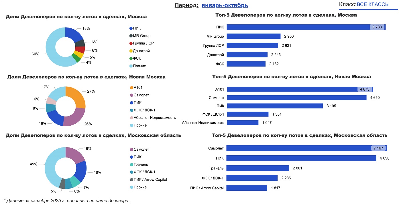 Структура девелоперов — лидеров по количеству лотов в сделках, 2025 год