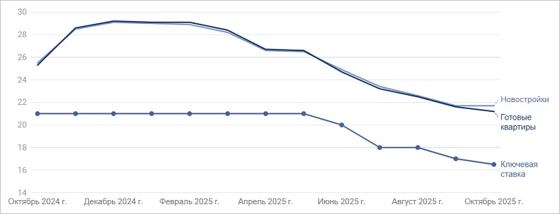 Средневзвешенные ставки по рыночным ипотечным программам в октябре снизились на 0,4 п. п. — 0,5 п. п. по направлениям рефинансирования (до 22,4%), вторичных квартир и готовых жилых домов (до 21,2%).