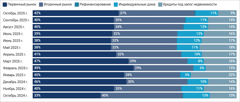 В структуре выданной ипотеки наибольшую долю заняло первичное жилье — 42% (+2 п. п. к сентябрю).