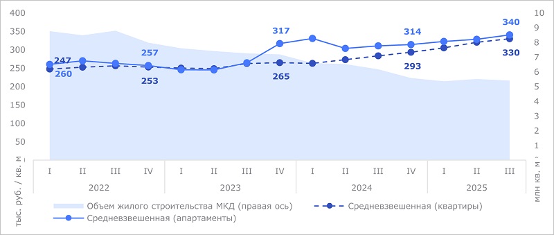 Средневзвешенная цена первичной жилой недвижимости Санкт-Петербурга к концу сентября увеличилась до 331 тыс. руб. за 1 кв. м (+3% за квартал и +16% за год).