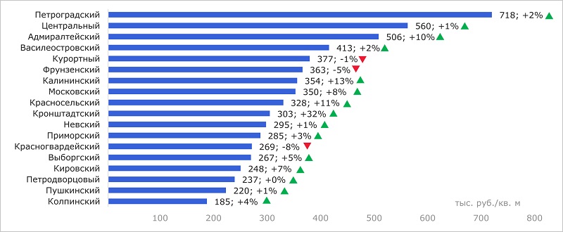 Снижение средних цен произошло во Фрунзенском районе (в связи с их коррекцией в ЖК Дом на Курской), а также в Курортном и Красногвардейском районах (где изменилась структура экспозиции).