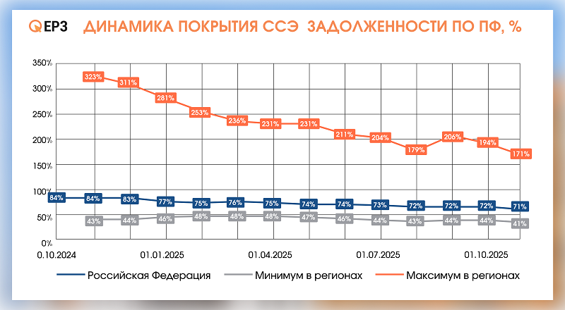 Возглавляют ТОП Тульская область, Хабаровский край и Нижегородская область, где покрытие ССЭ задолженности по ПФ на 1 ноября составило соответственно 97%, 92% и 88%. При этом за месяц показатель ухудшился во всех этих регионах.