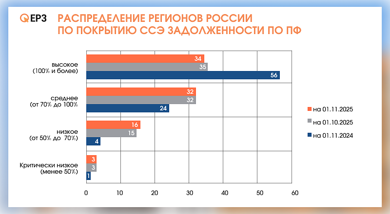 • высокое покрытие (ССЭ превышают задолженность по ПФ или задолженность отсутствует) — в 34 регионах. За месяц таких регионов стало на один меньше, за год их количество снизилось на 22;