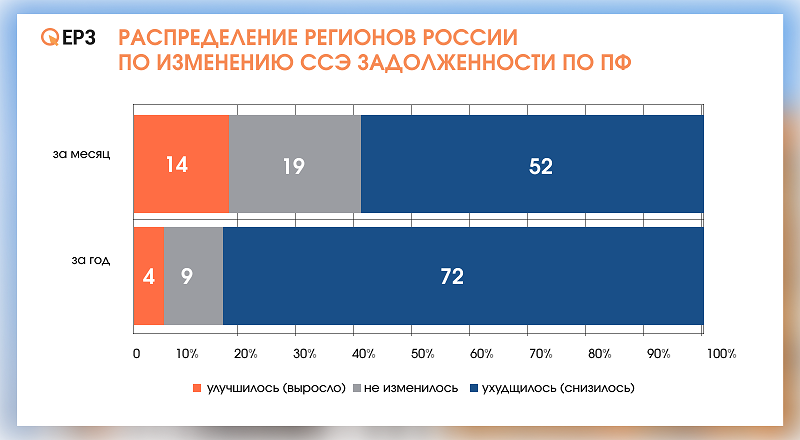 За месяц уровень покрытия ССЭ задолженности по ПФ ухудшился в 52 регионах, за год — в 72. За месяц ситуация улучшилась в 14 субъектах, за год — в четырех.